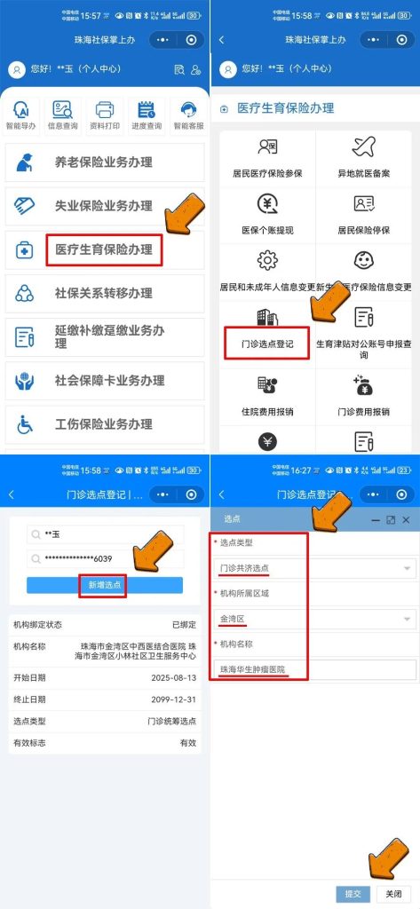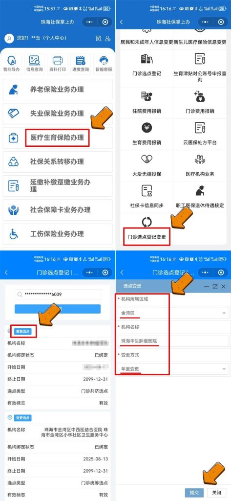 微信搜索进入“珠海社保掌上办”微信小程序(右下角旧版切换) → 选择“医疗生育保险办理” → 选择“门诊选点登记变更” → 点击已绑定生效的机构信息(门诊共济选点)“变更选点” → 选择机构所属区域“金湾区”、机构名称“珠海华生肿瘤医院” 、变更方式“年度变更”→ 提交